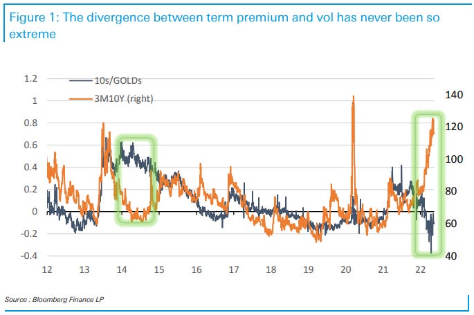 In the context of the history and the logic that links the two measures of interest rate risk, the recent divergence is a sign of a structural break, which highlights the underlying inconsistencies of the rates manifold. While vol shot up in the most dramatic way, the term premium of the curve continued to compress to its historical extremes. On the one hand, rates volatility has been taking off due to both realized moves and on the back of growing uncertainties regarding the long end of the curve and the rising protection against it; on the other hand, the market’s abdication on the long-term outlook, beyond the near-term Fed action, has kept the curve anomalously flat. This divergence in the direction of two measures of (the same) rates uncertainty, together with their magnitudes, underscores the tensions and inconsistencies buried in the current shape of the yield curve.