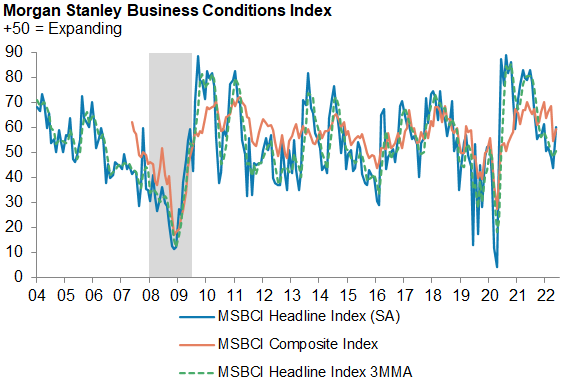 The MSBCI bounced back in May after hitting a two-year low in April, with mixed underlying details pointing to a pullback in capex plans, while hiring remains broadly intact. Price pressures remain very elevated as analysts report little improvement in supply conditions.