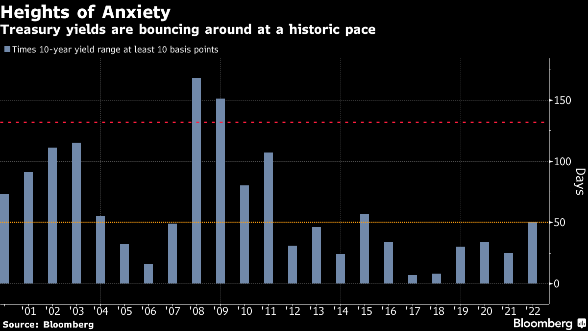 First is a visual from BBG noting UST yields over past 2d saw 10yy jump 10bps then drop 10bps. While this may SEEM normal (50th day this year with 10bps (or more) range on 10yy) it’s more than any full year since 2015.