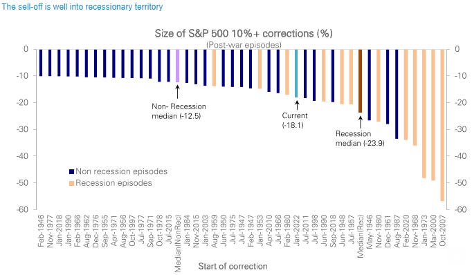 In the event we do slide into recession, we see the market sell-off going well above average, i.e., into the upper half of the historical range given elevated initial overvaluation, -35% to -40% or S&P 500 3000.