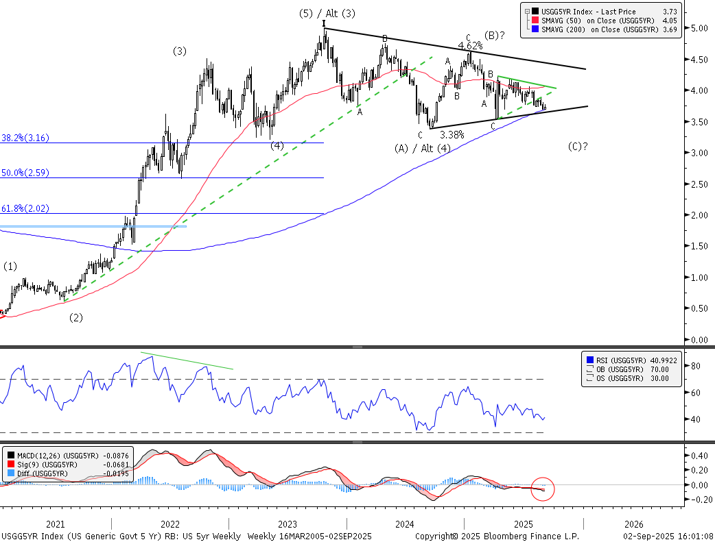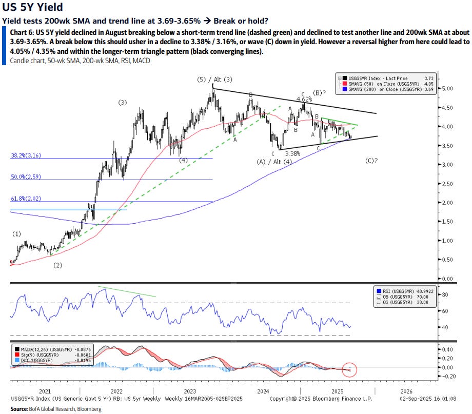 US 5Y yield: The August decline broke tactical yield support, but medium-term yield support from a trend line and the 200wk SMA remains at about 3.69-3.65%.
