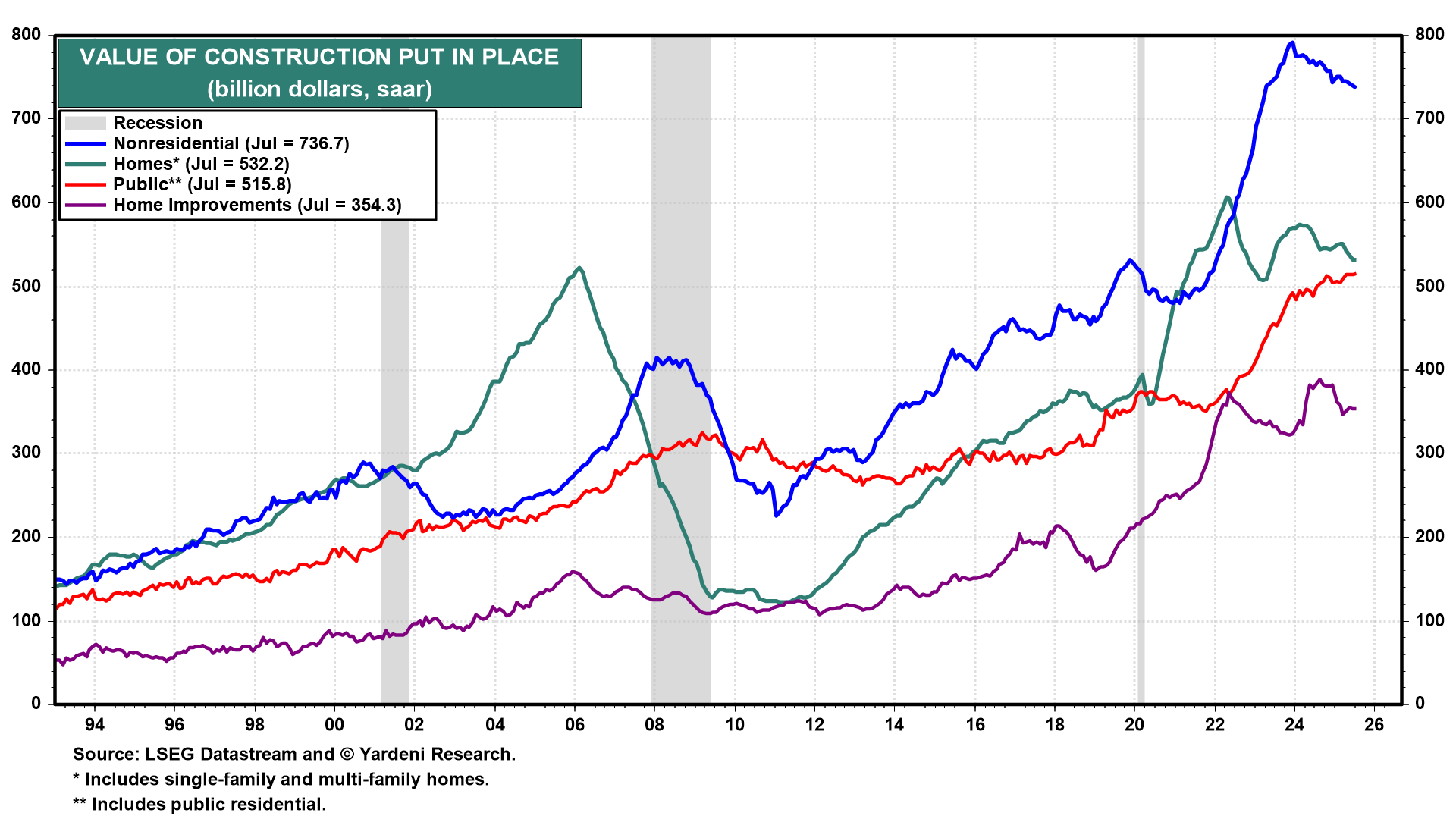 Another set of weak indicators came out yesterday for July's construction spending (chart). Total spending reached a record high of $2.22 trillion in May 2024. It is down only 3.6% since then through July. On the weak side have been nonresidential and residential construction. Public construction spending and spending on home improvements have been relatively stronger.