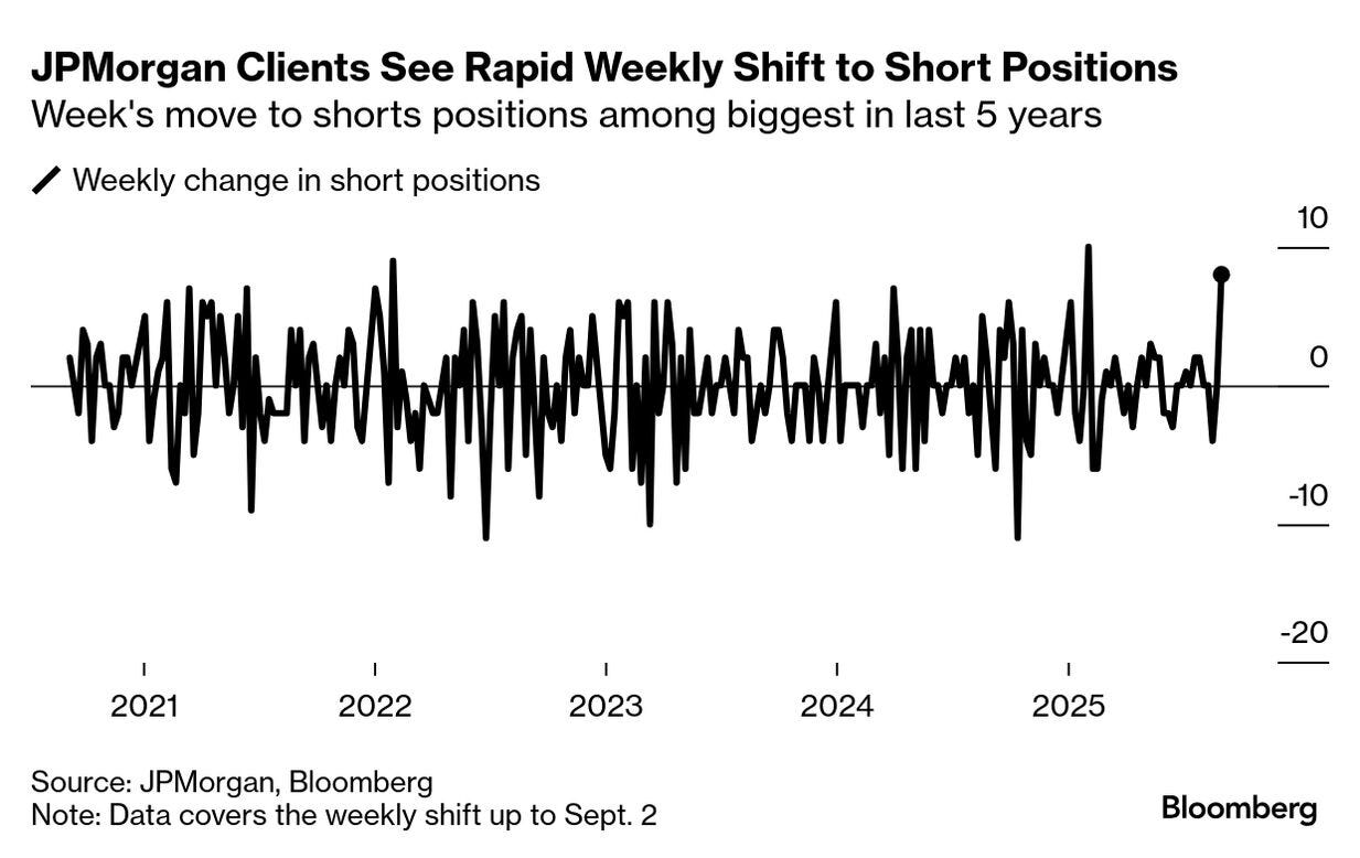 The pessimistic mood was captured in the latest JPMorgan Treasury client survey, showing one of the largest weekly shifts to bearish positioning seen over the last five years taking place in the period to Sept. 2. With fiscal worries pushing 30-year yields to just shy of 5%, short wagers stand at their highest level since February.