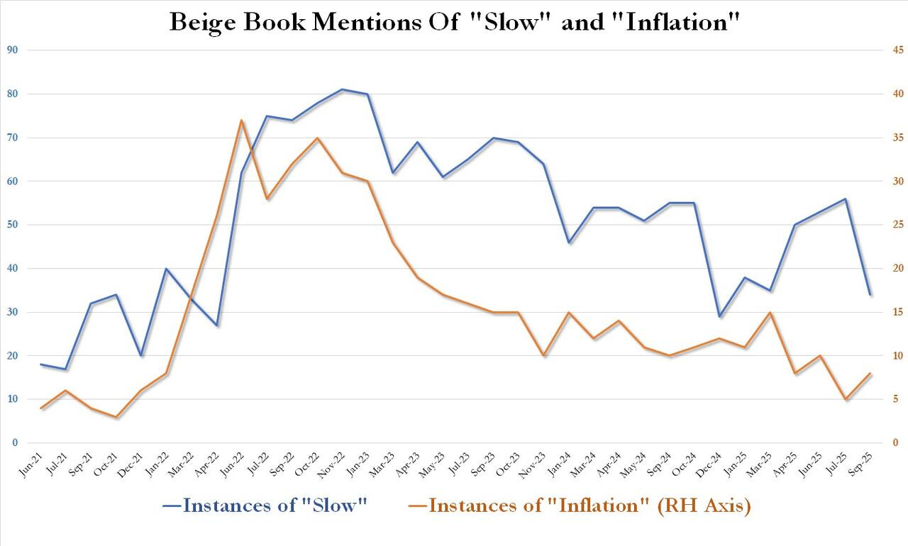 … And finally, confirming that contrary to conventional wisdom the economic picture appears to have improved notably April, the latest Beige Book found that despite media narratives to the contrary, mentions of inflation remained near a 4 year lows, at just 8 in September, and up from the cycle low of 5 in July (effectively before the Biden inflationary explosion period) while mentions of "slow" tumbled from a two year high of 56 in July to just 34, indicating that according to the Fed respondents, neither inflation nor an economic are major concerns any more.