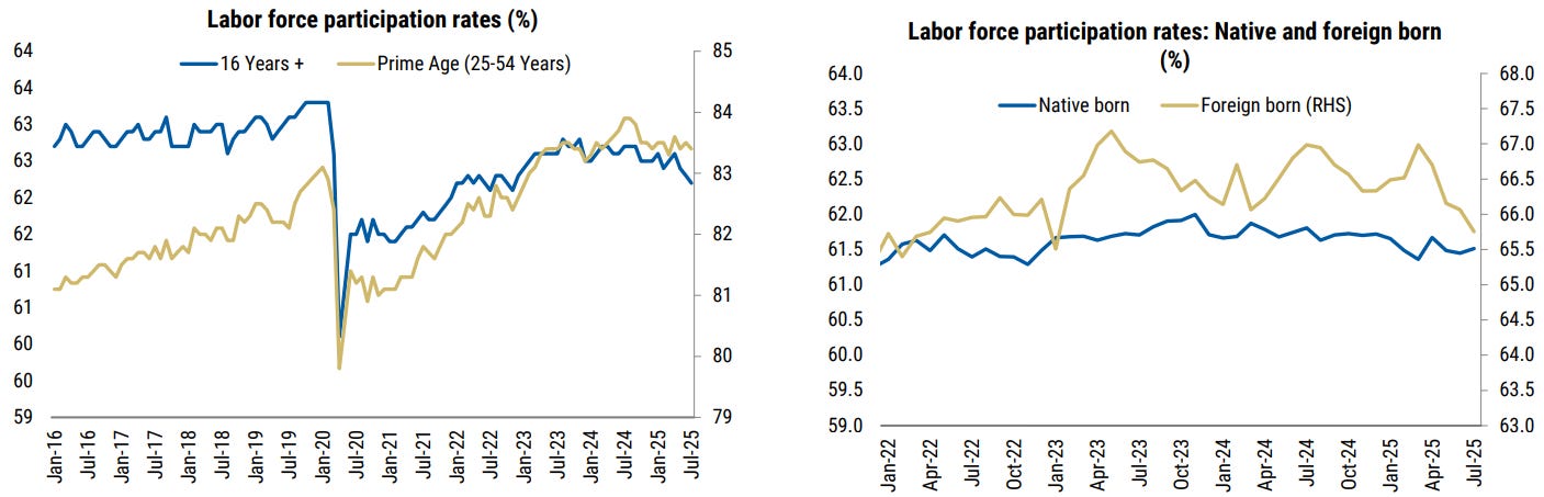 The labor force participation rate has declined 0.4pp over the past four months. This has been led by a decline in participation rates for foreign-born workers, which we believe could be a chilling effect from stricter immigration policies. A lower labor force participation rate helps keep the unemployment rate low, even as labor demand slows.