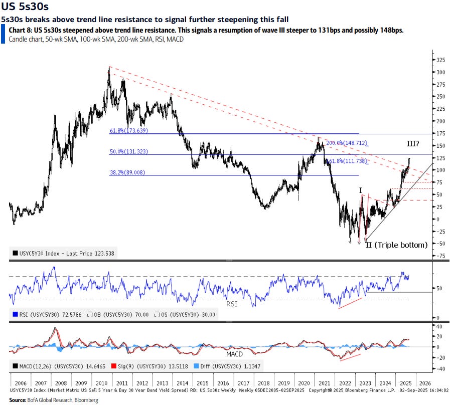 US 5s30s: Steeper curves resumed in August and caused long term trend line resistance that began in 2011 to break. 131bp & 148bp may be seen in 2025…