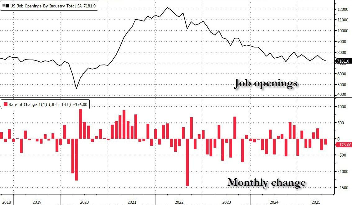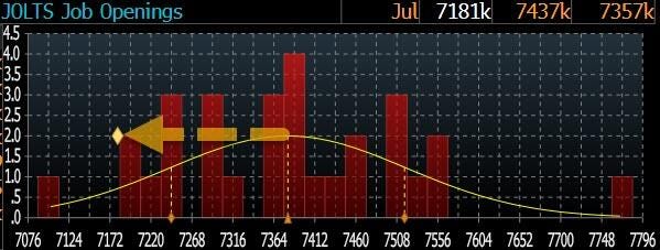 … Well, moments ago the BLS reported that in July the number of job openings tumbled by another 176K from a downward revised 7.357MM(originally 7.437MM), to 7.181MM, which not only came in far below the median consensus estimate of 7.380MM and below 28 estimates from the 29 economists polled by Bloomberg...