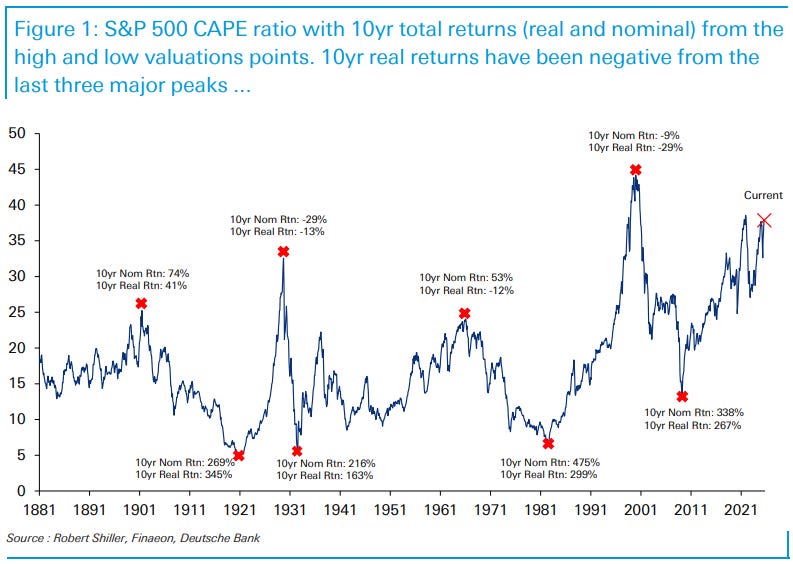 DB CoTD: Valuations have mattered for returns...…Looking back over 150 years, the contrast is stark: when valuations are high, forward returns are consistently weak. From the last three major valuation peaks, 10-year real total returns were all negative—a striking outcome given that US equities have historically delivered around 7% annualised real returns. Conversely, when valuations have been low, the subsequent decade’s returns have been extraordinary.