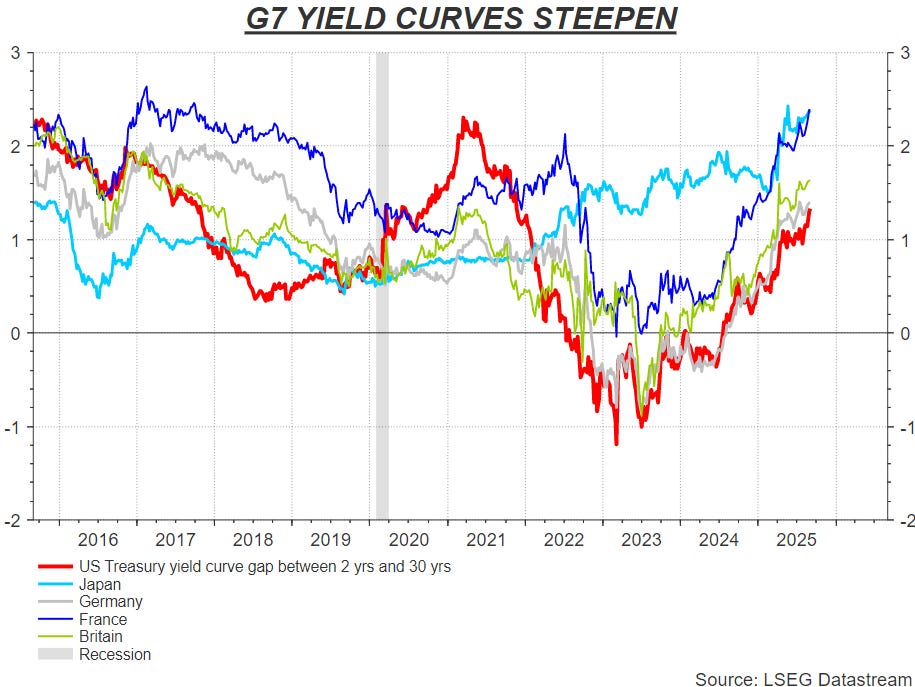 Meanwhile, longer-term yields have headed higher in recent weeks as investors demand increased compensation for financing government deficits. The Trump administration’s spending and tax cut plans are projected to worsen the country’s fiscal position unless tariff revenue growth is sustained, an outcome that a federal court ruling jeopardized last week.