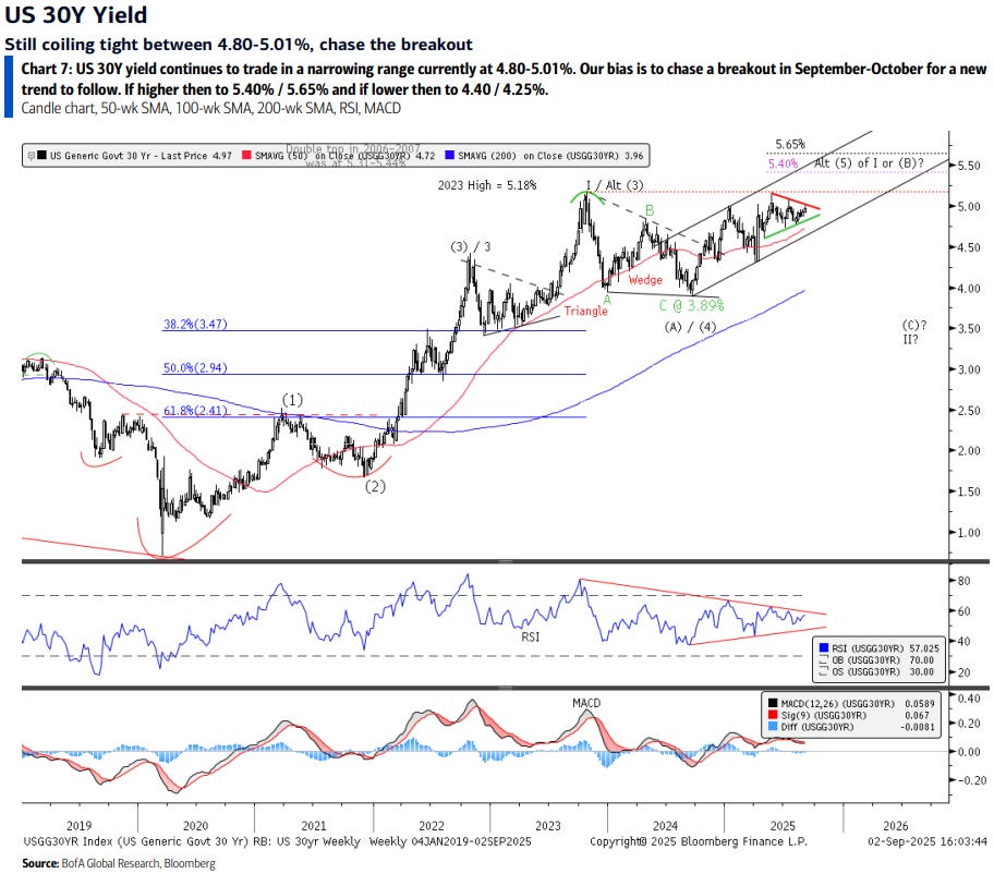 US 5Y yield: The August decline broke below tactical yield support, a medium-term yield support line and the 200wk SMA remain at about 3.69-3.65%. US 30Y yield: Stuck in a narrowing range of 4.82-5.01% with a breakout worth chasing coming due in SeptOct. US 5s30s: Steeper curves resumed in August and caused long term trend line resistance to break, 131bp & 148bp may be seen in 2025. Gilt 10Y Yield: September began with an upside breakout > 4.80% as upside risks are rising.