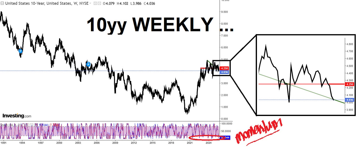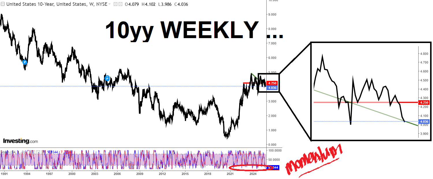 10yy WEEKLY (line): 4.25% support and ~4.00% resistance in greater context …