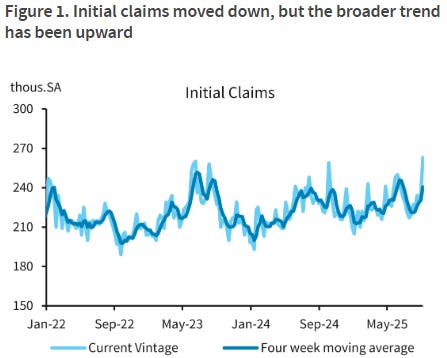 BMO: Jobless Claims Highest Since Oct 2021; Core-CPI +0.346% in AugCPI in August came in at +0.4% MoM vs. +0.2% MoM in July and +0.3% MoM consensus. This is the highest since January. The YoY pace increased, as-expected to 2.9% vs. 2.7% prior. Core-CPI was +0.3% (unrounded 0.346%) -- in line with expectations. YoY core-CPI was unchanged at 3.1%. Core-CPI services ex-shelter came in at +0.225% in August vs. +0.550% in July while core-CPI services ex-rent/OER was +0.330% versus +0.479% prior. Core goods were +0.3% in August (+0.276% unrounded) -- indicating limited tariff passthrough. Initial Jobless Claims for the week of Sept 6 came in at 263k vs. 236k prior and 235k forecasted -- the highest since October 2021. Continuing Claims printed at 1939k vs. 1939k prior and 1950k anticipated. Overall, this set of data reinforced the limited inflationary fallout from the trade war (thus far) and the mounting concern that the labor market is quickly weakening. This clears the way for a 25 bp cut next week and leaves 50 bp on the table, although we remain in the 25 bp camp.