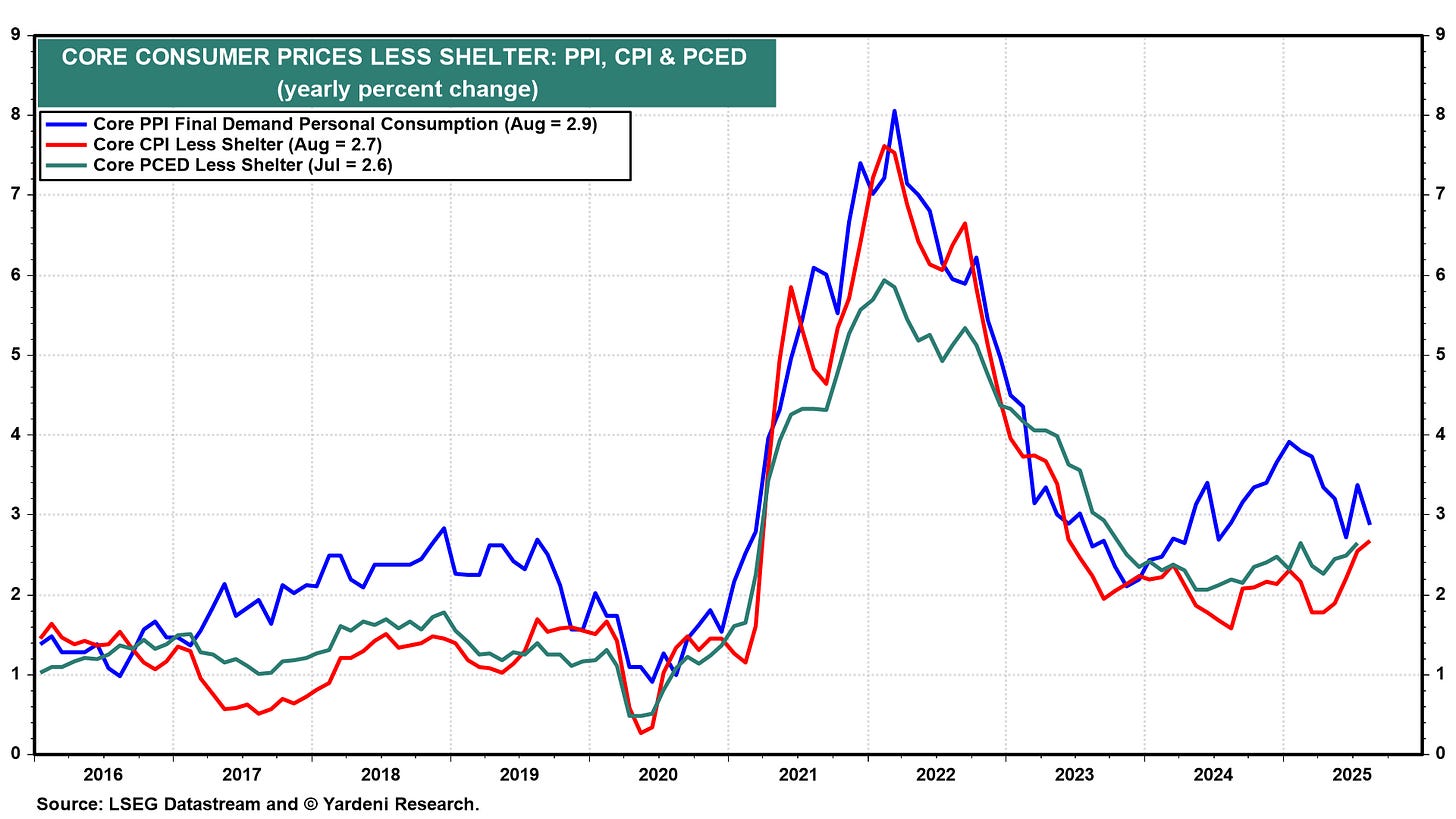 (4) Inflation. Meanwhile, the core CPI, core PCED, and core PPI for consumption—all excluding shelter—are closer to 3.0% than to 2.0%, as noted above (chart).