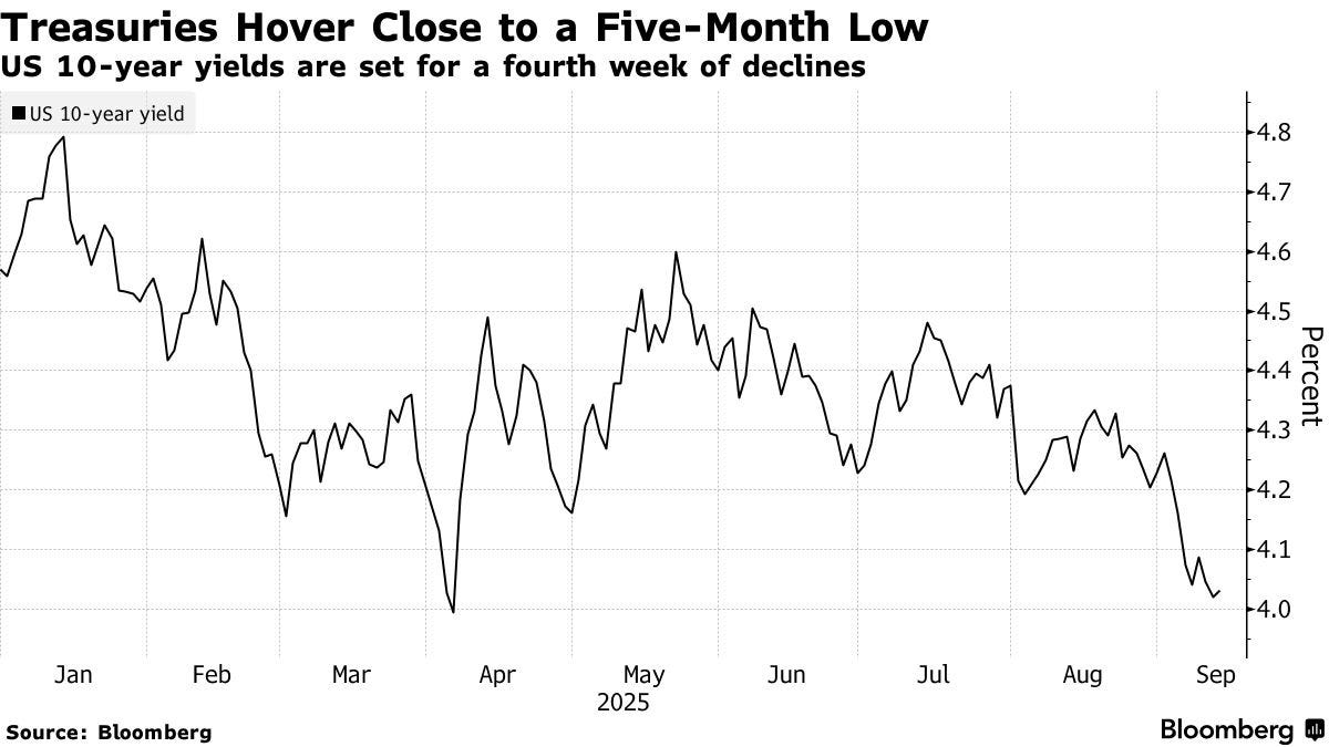 Bloomberg: Traders Lock In Fed Bets, Boosting Treasuries for Fourth WeekTreasuries were set to extend their rally into a fourth week after Thursday’s jobless claims data cemented expectations the Federal Reserve will cut interest rates next week.