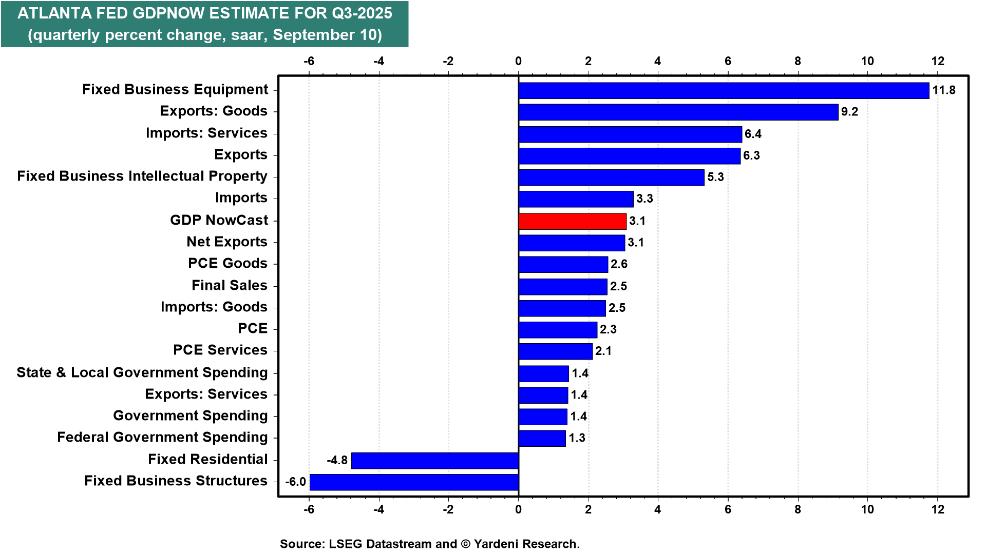 (1) GDP. Yesterday, despite August's weaker-than-expected employment report, the Atlanta Fed's GDPNow model estimated that real GDP rose 3.1% (saar) during Q2, up from 3.0% on September 4 (chart). Capital spending on equipment and exports are robust. Consumer spending is solid at 2.3%. Real GDP was up 3.3% during Q2.