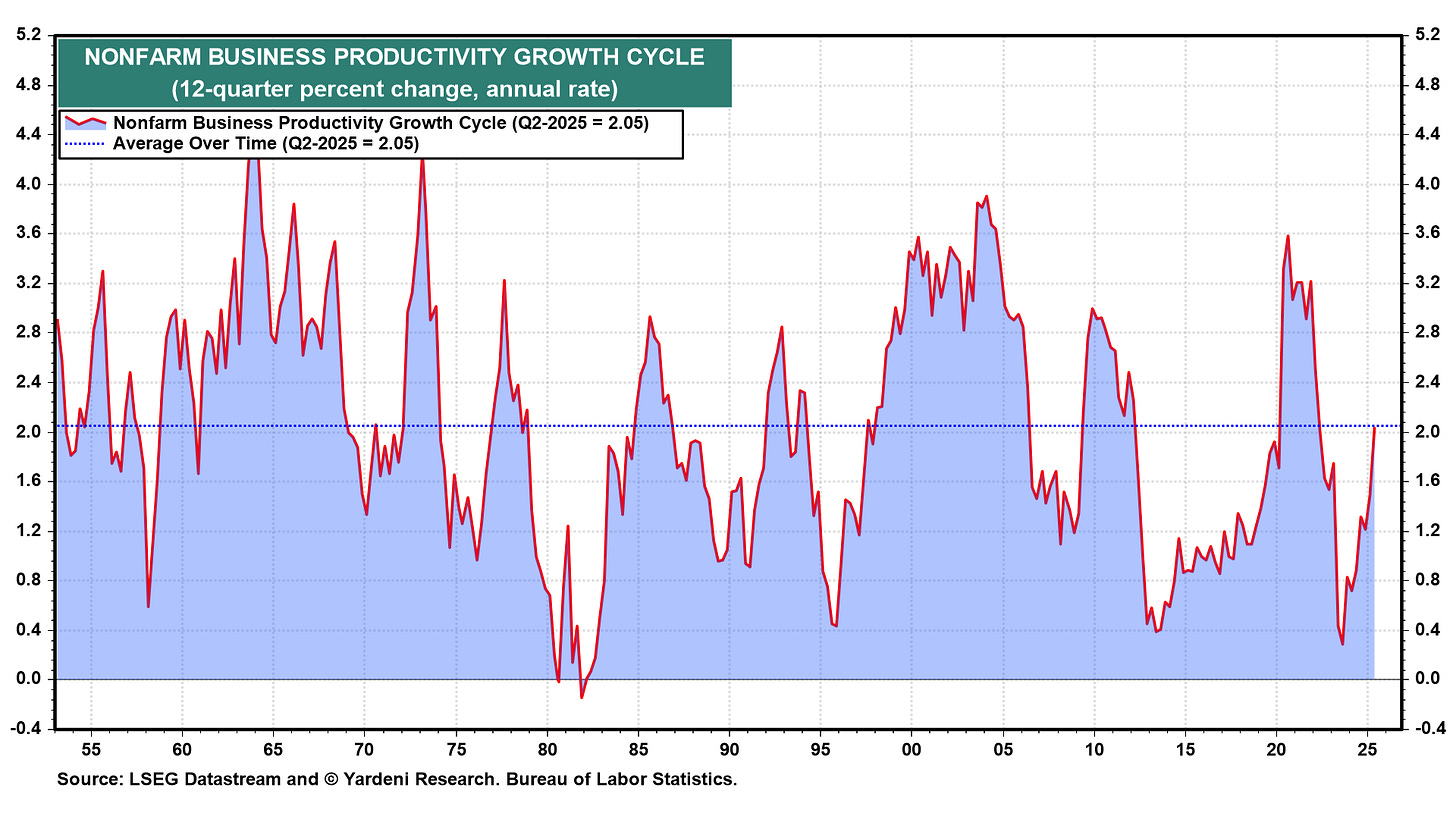 We are still not convinced that the economy needs to be stimulated by the Fed. Inflation remains closer to 3.0% y/y than to the Fed's 2.0 target. Real GDP is growing solidly despite the recent downward revisions in payroll employment. The unemployment rate remains between 4.0% and 4.3%. All this implies that either real GDP will weaken significantly and the jobless rate soon will rise sharply, or that productivity growth is making a strong comeback. We pick Door #2!