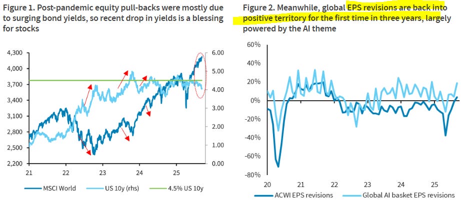 Don't fight the Fed, Don't fight AI. Equity markets continue to melt up even as dovishness extends in the rates market. The latest inflation prints (both CPI and PPI) in the US reinforced this pricing further, with rates markets now looking for c.6x cuts over the next year and a terminal rate of c.3%. And after the soft labour market data last week (NFP, Jolts and ADP), the downward payroll revisions of 911k along with a further rise in jobless claims to cycle high this week solidified the case for Fed to resume its cutting cycle sooner rather than later. However, while restart of Fed cuts after a significant pause has historically come amid increased recession risk, it doesn't necessarily confirm one (see What happens after Fed cuts resume?, 10 Sep). So far indeed, activity remains resilient and data surprises are positive elsewhere, suggesting that the economy is still holding up okay, keeping downturn concerns at bay. Meanwhile, the AI theme remains another powerful tailwind for equities. Recent earnings from Oracle and Alibaba highlighted strong momentum in their cloud and infrastructure divisions, triggering sharp rallies and lifting sentiment across the broader tech and AI ecosystem. Both US and China tech sectors are seeing robust EPS momentum, which is increasingly supportive for aggregate equity earnings given the size and influence of these firms. Consequently, investors have taken a glass half full approach, which we agree with. But with equity markets at all time high, volatility at lows and rate expectations sharply lowered already, we believe that further weakening in employment would likely start challenging the well-priced Goldilocks narrative. So hedging for the left tail risk still makes sense to us.