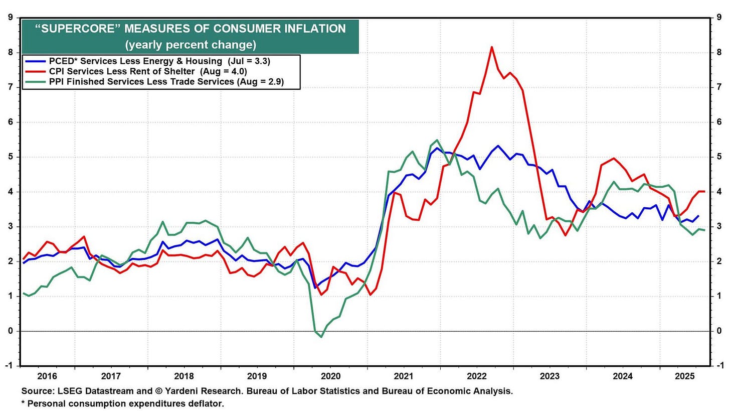 Trump's tariffs have caused a slight increase in durable goods inflation. That is likely to be a transitory problem. A stickier problem is that measures of the "supercore" inflation rate remain sticky between 2.9% and 4.0% (chart).