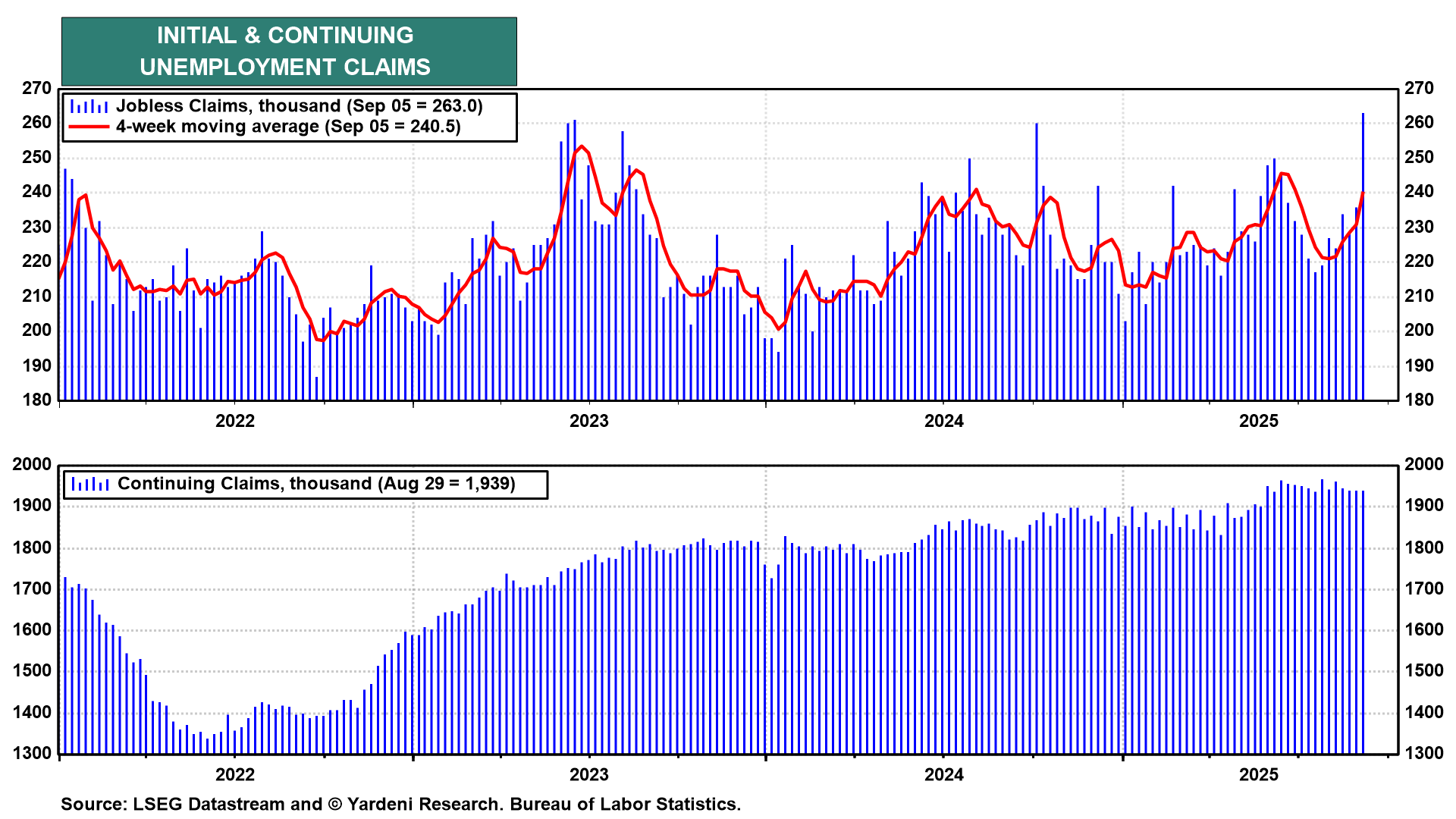 (2) Labor market. Initial unemployment claims jumped 27,000 last week to 263,000 (seasonally adjusted), the highest reading so far this year (chart). This number could persuade a few FOMC participants to press for a 50-basis-point rate cut. So far, it is only a one-week spike, which has occurred occasionally in the past. In addition, 15,000 of the increase (not seasonally adjusted) occurred in Texas. That seems like a one-time aberration, unless a large number of oil field workers were let go last week.